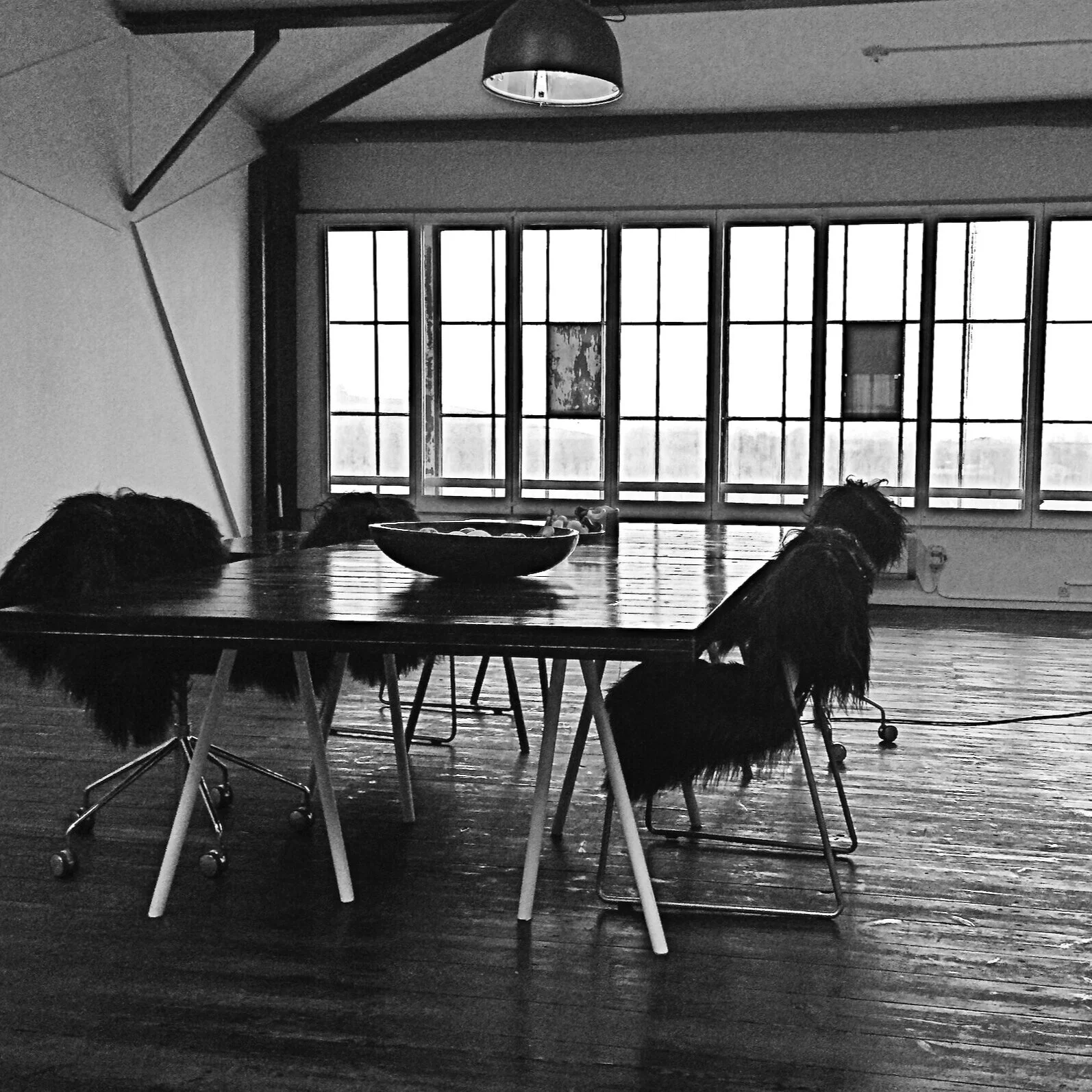 The room was often showered in sunlight, therefore the choice of dark objects and dark floor, mixed with maritime signal colours, created a fundamental warmth and humour in the room. Most objects in the room were equipped with wheels enabling the decor to be changed quickly. All painting and patina was based on linseed oil products.