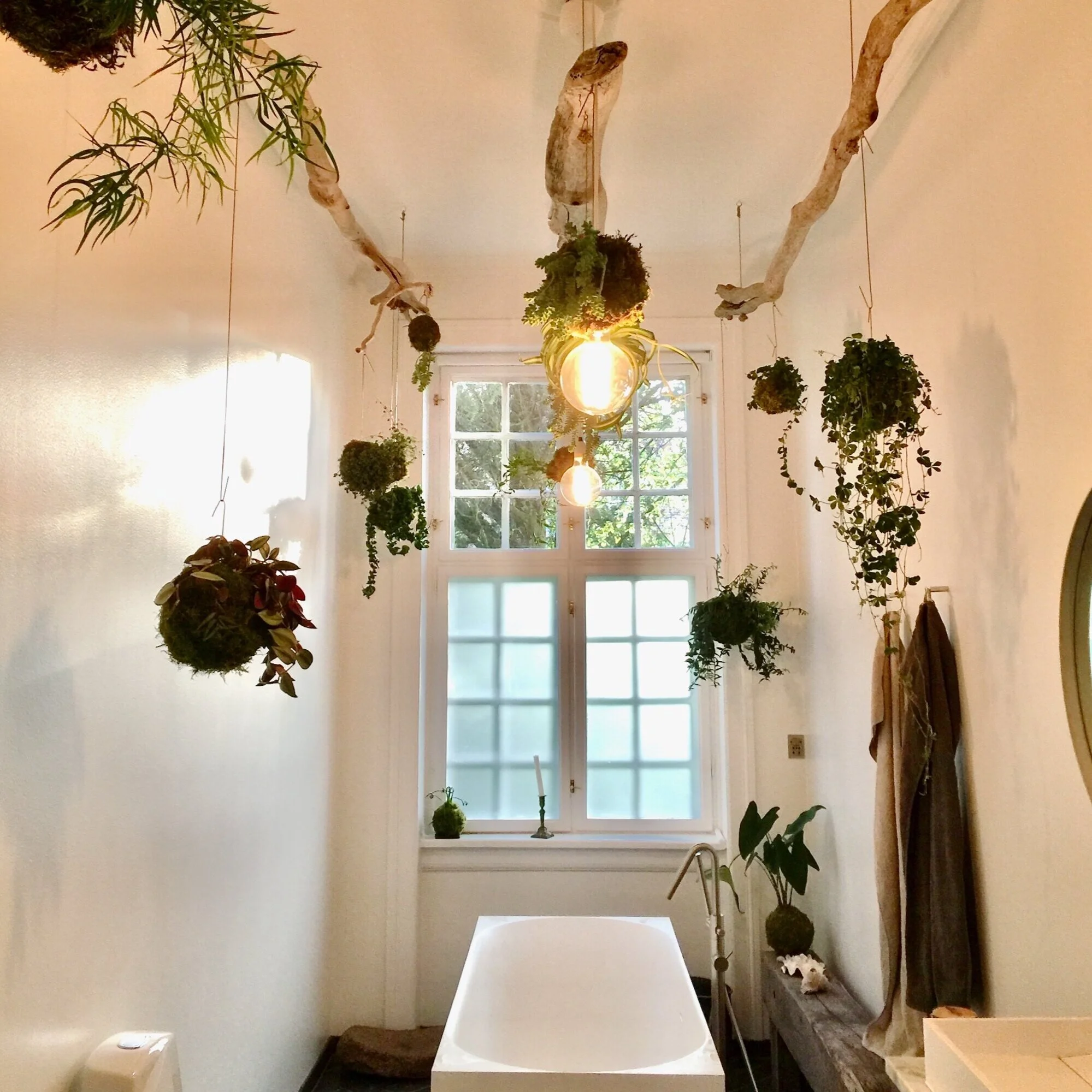 The idea for the hanging kokedama plants arose from the customer's desire to give life and warmth to their bathroom. Kokedama is a Japanese plant technique. The Kokedama plants are suspended in long hooks of brass thus enable the plants to be lifted off easily for regular watering. The plants hang from three bleached longitudinal tree trunks of driftwood. The bathroom got the desired effect of; heat, moisture and scent - and appears as a functional greenhouse of the home.